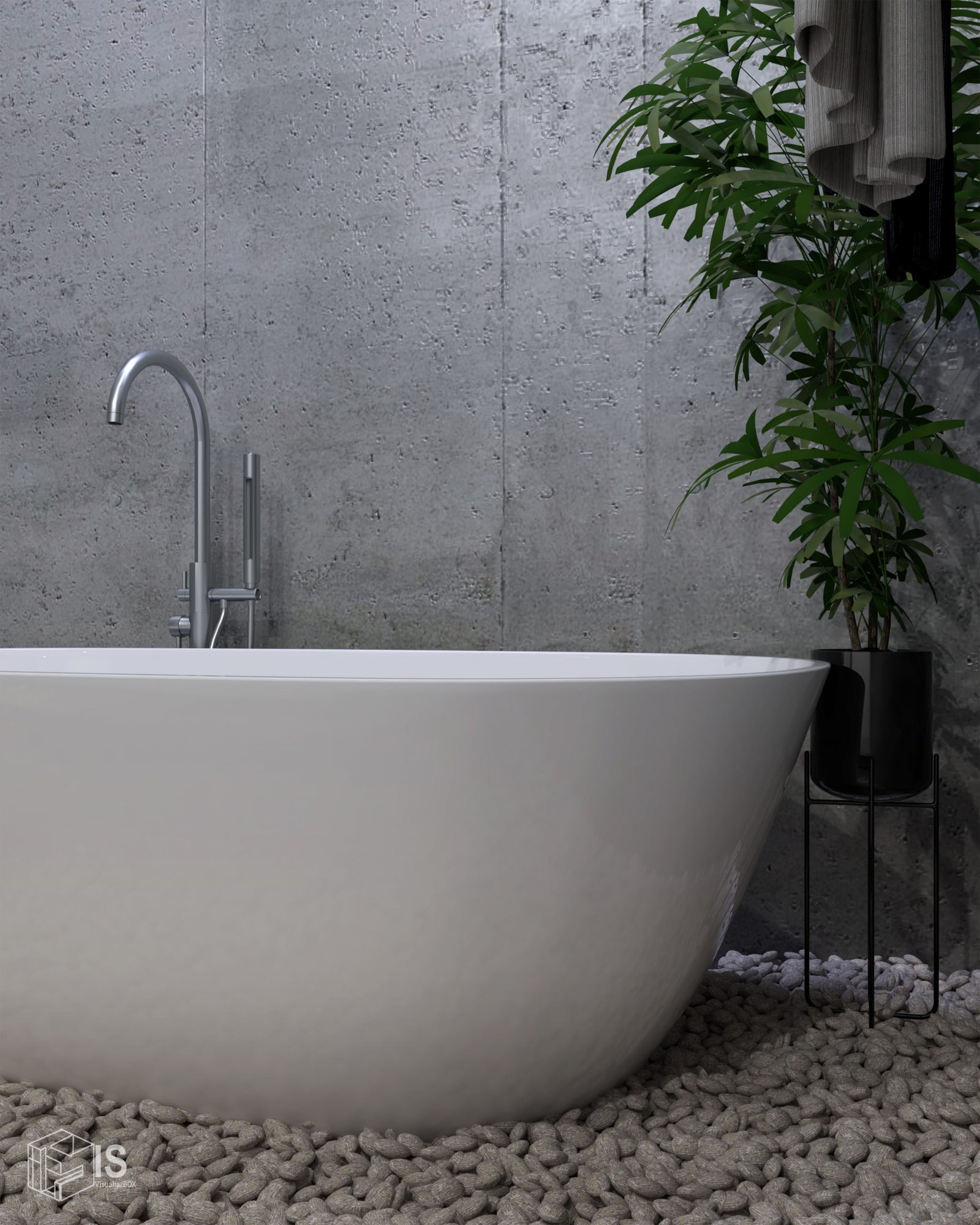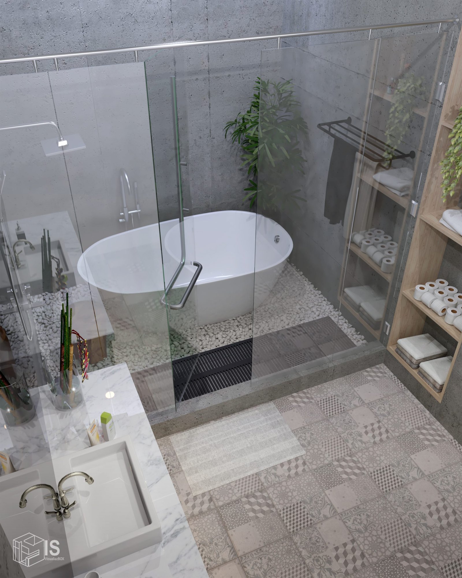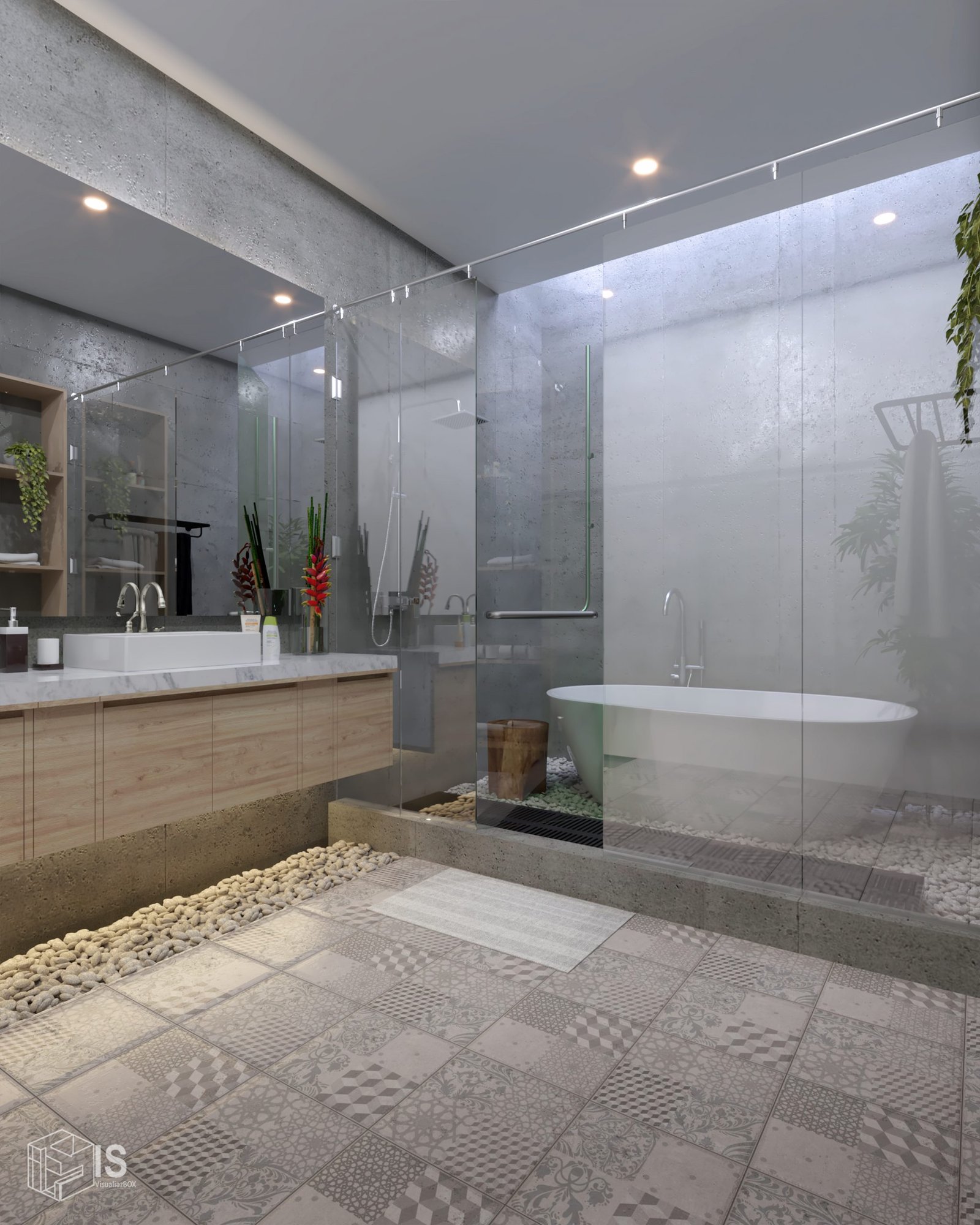 Baru krikil putih pada area basah. Sebagai treatmen lantai agar dapat menyerap air dan merasakan feel berbeda.