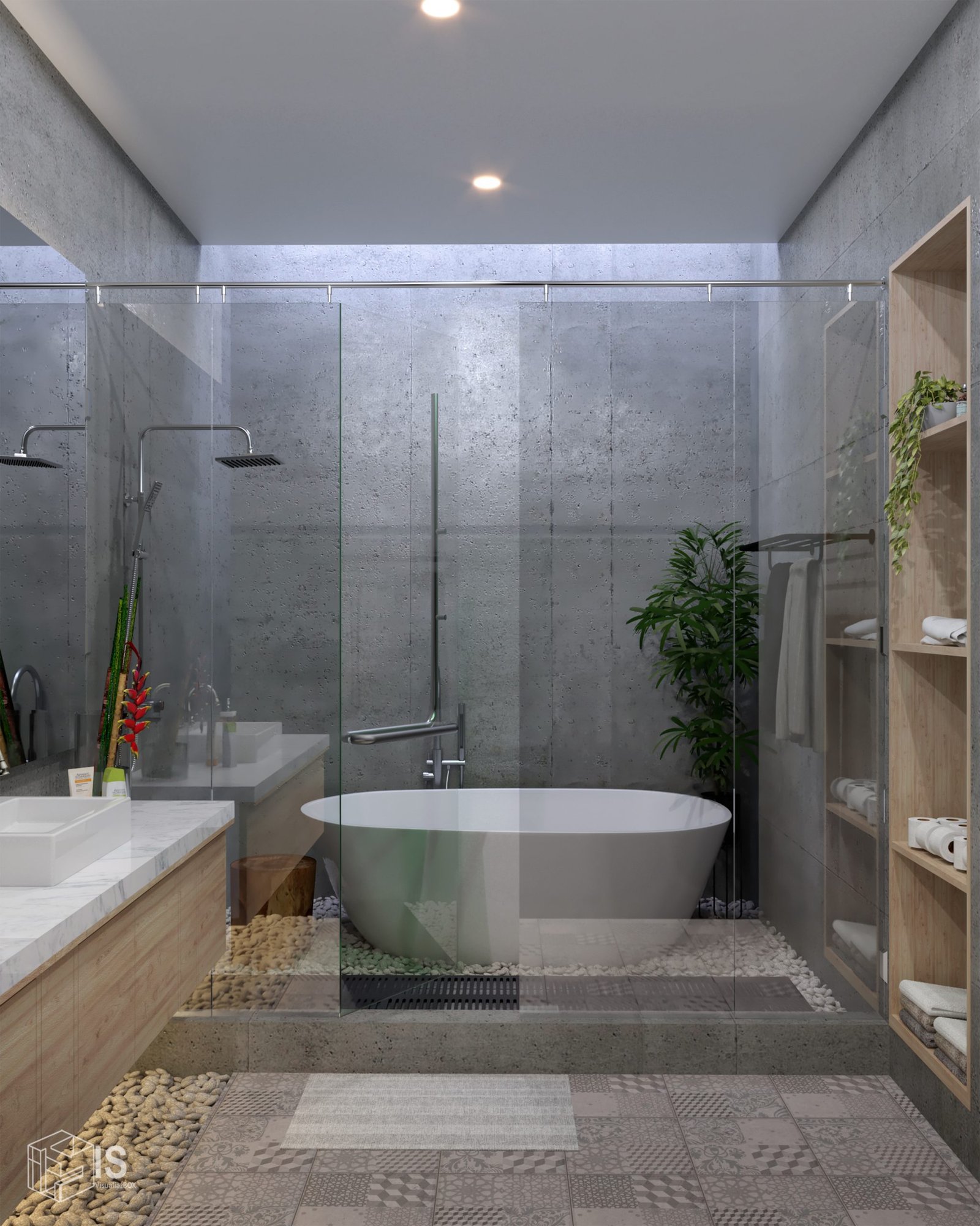 Hai. Kamar mandi dengan treatment ekspose dan memiliki skyligh pada area bathup sebagai pencahayaan natural dan membuat area lebih cepat kering.