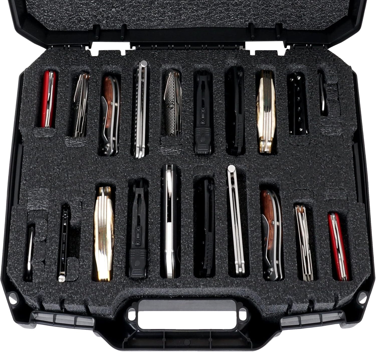 The 60 Folding Knife Carrying Case by Case Club holds up to 60 Folding Knives, Multi-Tools, Swiss Army Knives, and/or similar items in a convenient and compact case that is perfect for transportation & storage. This universal insert securely holds a variety of knife lengths to suit anyone’s needs. The foam is a non abrasive, shock absorbing, and extremely long lasting. The modular foam interior allows for a wide variety of knife combinations. This case was engineered to far exceed all competition and be the next level in organization, storage, and transport needs. Protect your investment, buy Case Club!